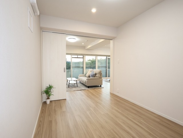 リビングダイニングから、洋室3の3枚引き込み戸を閉めた時の様子です。壁と同じ色の白系統の建具なので広く感じます。