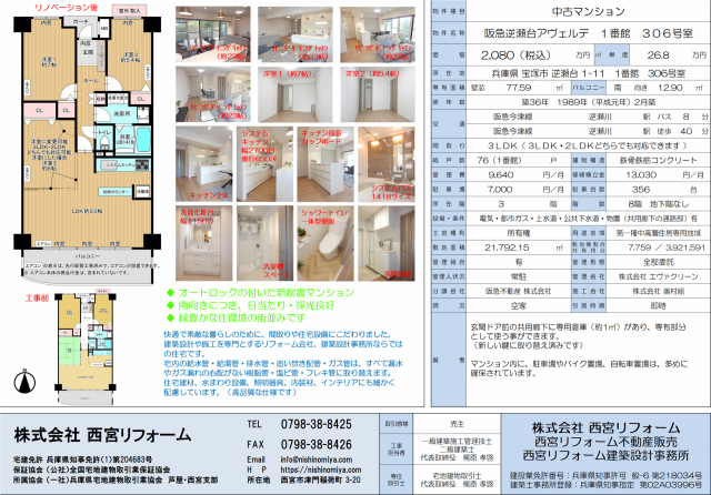 HOME > 販売物件・施工実績 > マンション > 販売物件(マンション) > 兵庫県宝塚市 阪急逆瀬台アヴェルデ 1番館 306号室 価格は、2,080万円(税込)です。
