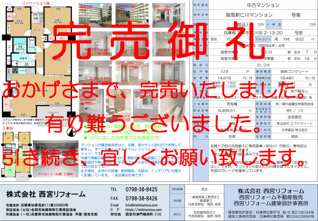 HOME > 販売物件・施工実績 > マンション > 販売物件(マンション) > 兵庫県宝塚市 阪急新仁川マンション 号室と価格は、販売が終了しているため、非表示とさせて頂いています。