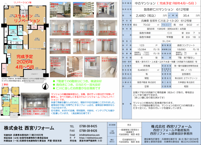 HOME > 販売物件・施工実績 > マンション > 販売物件(マンション) > 兵庫県宝塚市 阪急新仁川マンション 612号室 価格は、2,480万円(税込)です。2026年4月~5月完成予定です。
